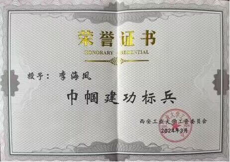 “牢记嘱托建新功,勇立潮头展风采”。近日,为喜迎第114个“三八”国际劳动妇女节,在西安工业大学工会开展的“巾帼建功岗”和“巾帼建功标兵”评选推荐活动中,我院教师李海凤被授予“巾帼建功标兵”荣誉称号。